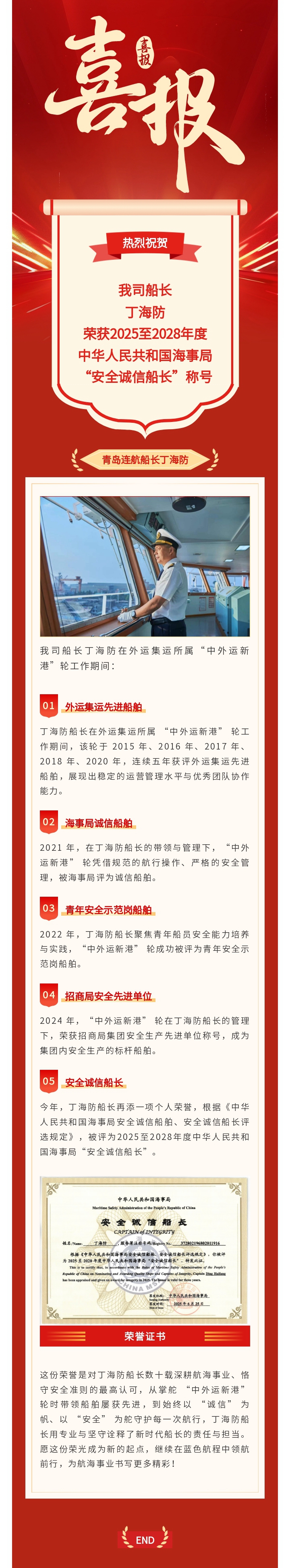 我司船長(zhǎng)丁海防榮獲“安全誠(chéng)信船長(zhǎng)”稱(chēng)號(hào)